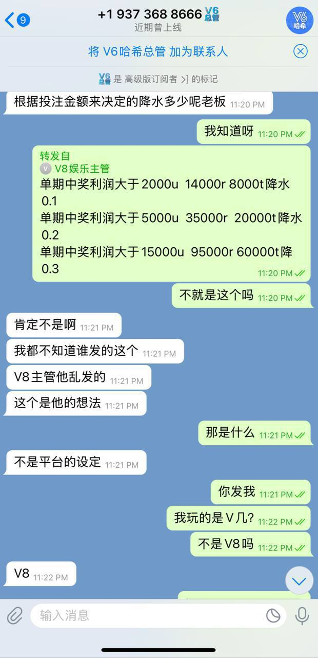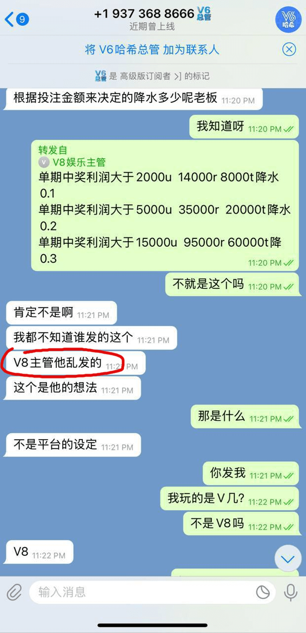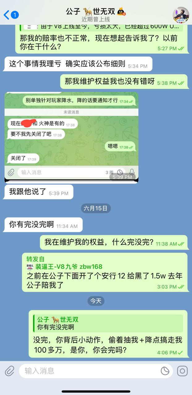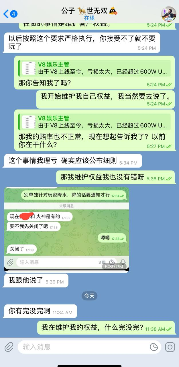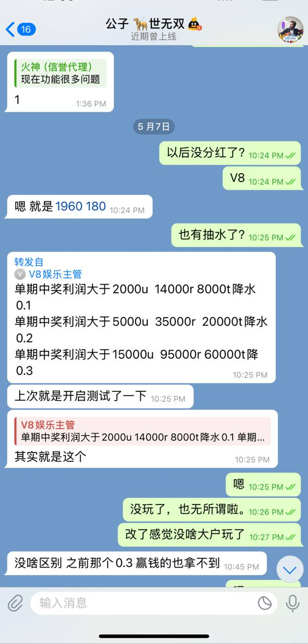 ● 5月份市场主管"公子" TG:@gongzi 告知"微调抽水",当时我没在V8玩,也未起疑在意【见附图】
